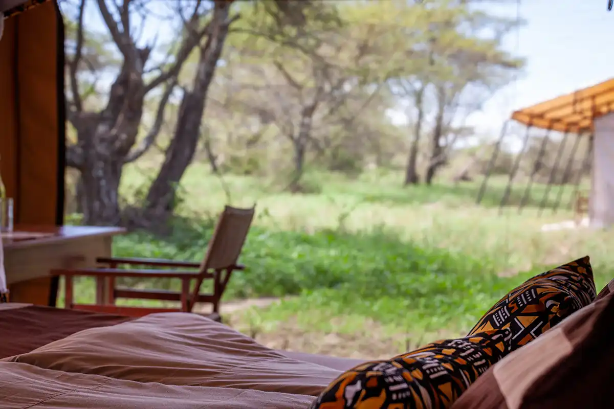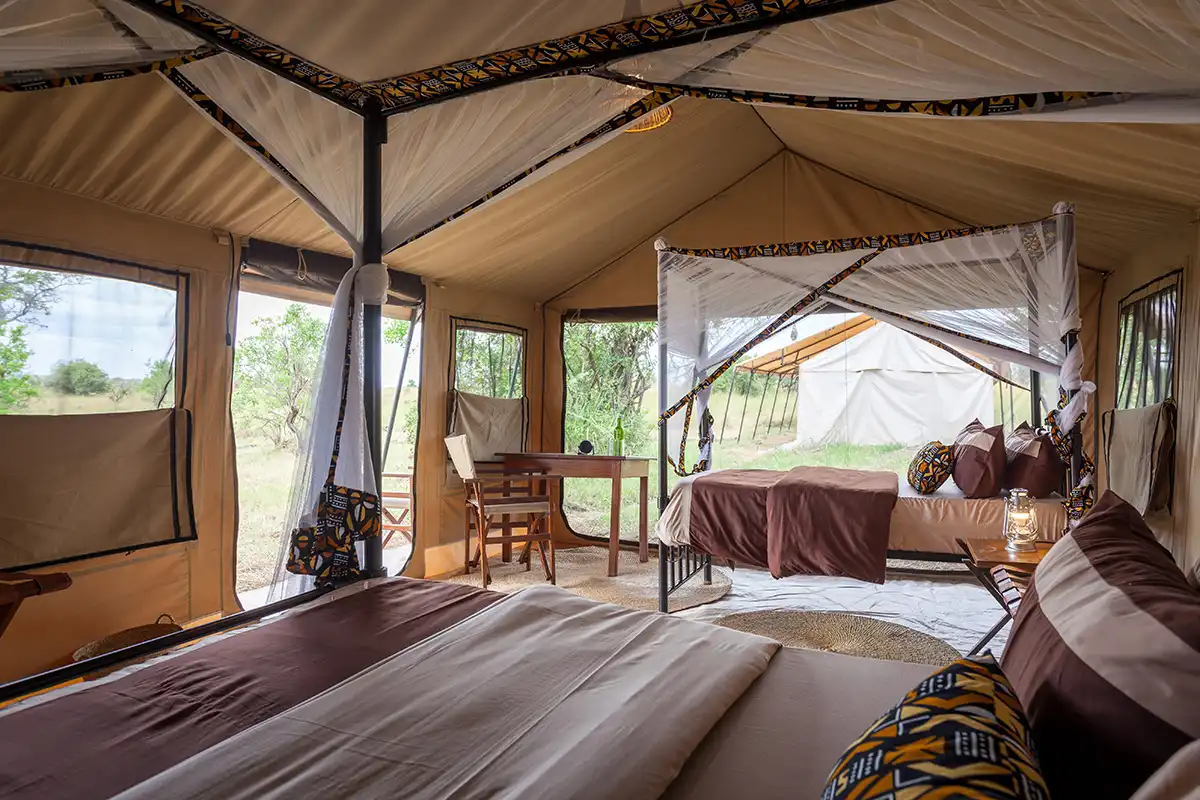 Gnu Ndutu Camp is a seasonal, mobile tented camp strategically located in the Ndutu region of the Ngorongoro Conservation Area, near the Serengeti National Park. This camp is specially set up to follow the Great Migration’s calving season, when thousands of wildebeests give birth on the vast plains, attracting numerous predators.